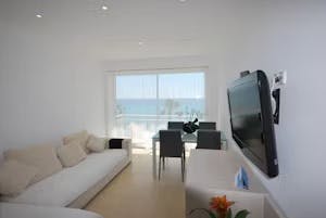 El apartamento cuenta con una superficie total de 80 m2, consta de 2 dormitorios, uno con cama King size y otro con 2 camas individuales, tiene 1 baño con ducha. Sala de estar con cocina completamente equipada, siguiendo una linea moderna y funcional para que su estancia sea lo más cómoda y grata posible. Todos los apartamentos disponen de aire acondicionado con bomba de calor, TV con satélite y conexión WIFI. El apartamento tiene tres balcones con fantásticas vistas al mar mediterráneo. En la zona común dispone de un gimnasio y una terraza con solarium y barbacoa.